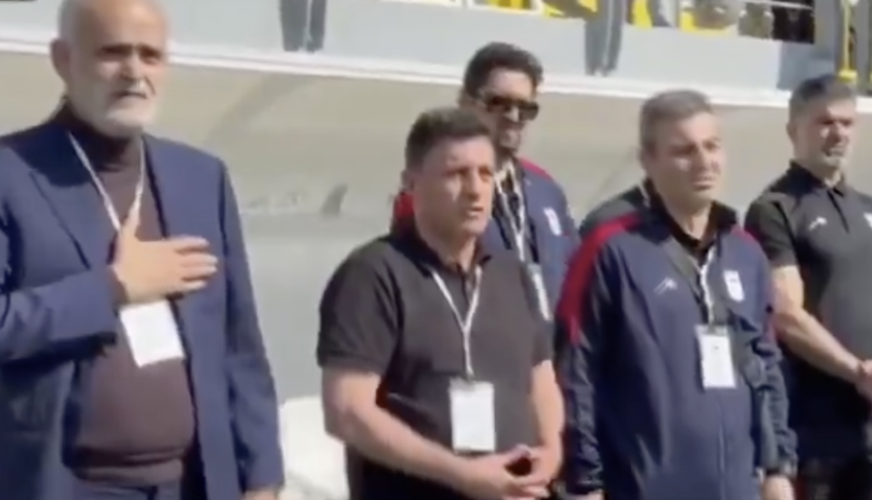 在场下,伊朗队的教练组成员均大声高唱国歌,且有人将手放在胸口,表达对祖国的忠诚以及对遇难学生的悼念。仪式结束后,现场多人鼓掌。