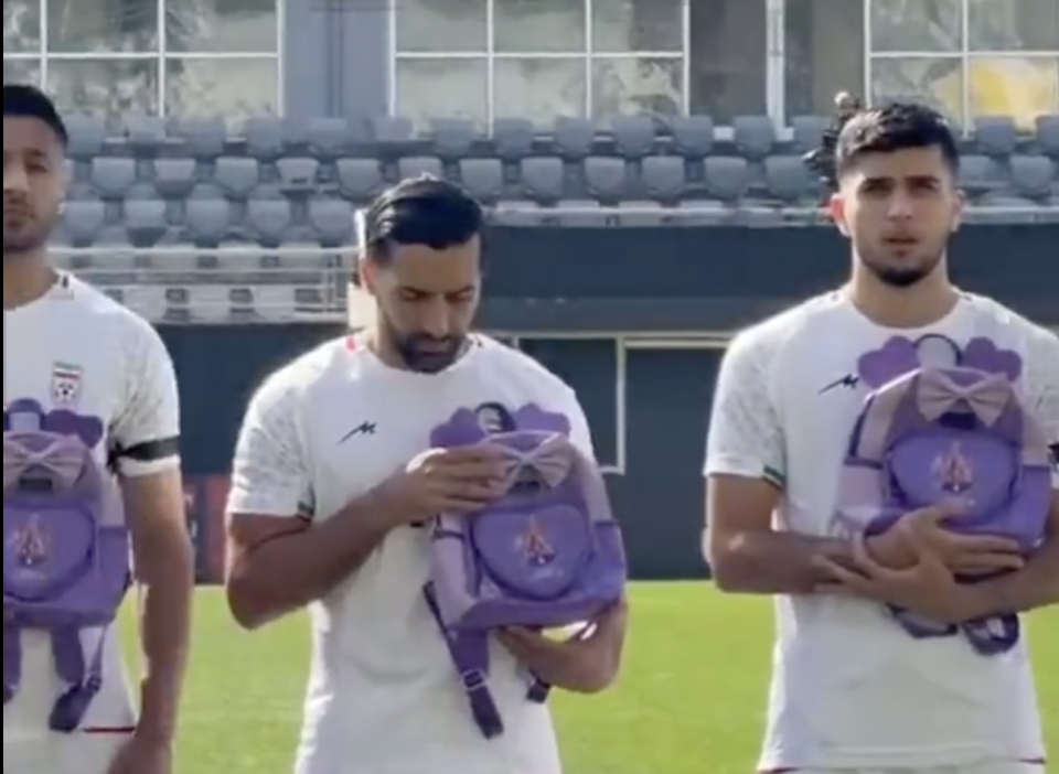 3月28日凌晨,国际友谊赛,伊朗男足对阵尼日利亚男足。赛前,伊朗男足全体成员手捧书包,高唱国歌,悼念在空袭中遇难的学生,场面让人动容。