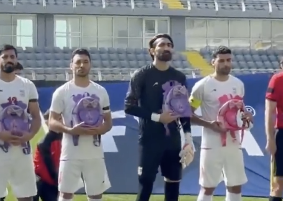 本场比赛是伊朗队在空袭发生后首次公开亮相。比赛场地在土耳其。赛前的奏唱国歌环节,伊朗全体球员手捧紫色的小书包,且臂缠黑纱,表情严肃。国歌声响起时,有人跟着音乐高歌,也有人在心里默唱。他们中很多人看上去眼中含泪。