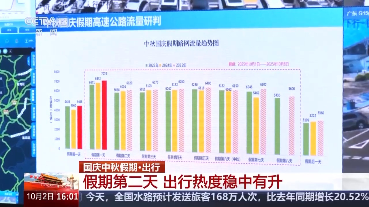 今天(2日)流量较第一天明显回落;预计3日和4日流量会有小幅度波动;10月5日,也是中秋节的前一天,预计可能出现假期第二个小高峰;而最后两天,公路路网车流量以中长途返程和部分短途返程车流为主,返程高峰凸显。